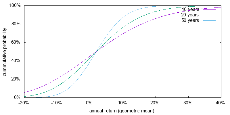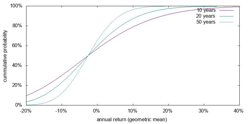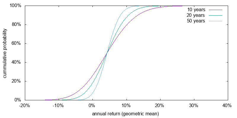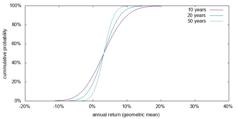 It is worth mentioning that the widening of the returns distribution has some pretty sobering effects. Taking the more promising -0.8% real margin rate, there is a non-zero chance of -10% annual returns for 50 years, which would reduce a portfolio to below 1% of its original value. Leverage shouldn't be attempted if you are not comfortable with this.